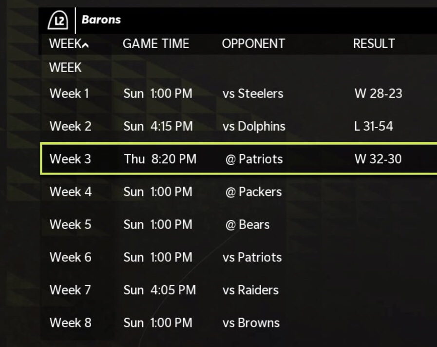Barons look to bounce back after a terrible game against with another divisional rival, The Patriots. Barons explode for 21 unanswered points in the first quarter but the Patriots scratch and clawed their way back to get a late lead in the 4th quarter.