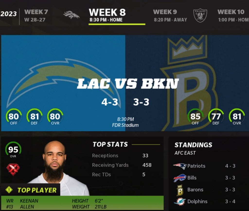 Brooklyn Barons (3-3) vs Los Angeles Chargers (4-3)