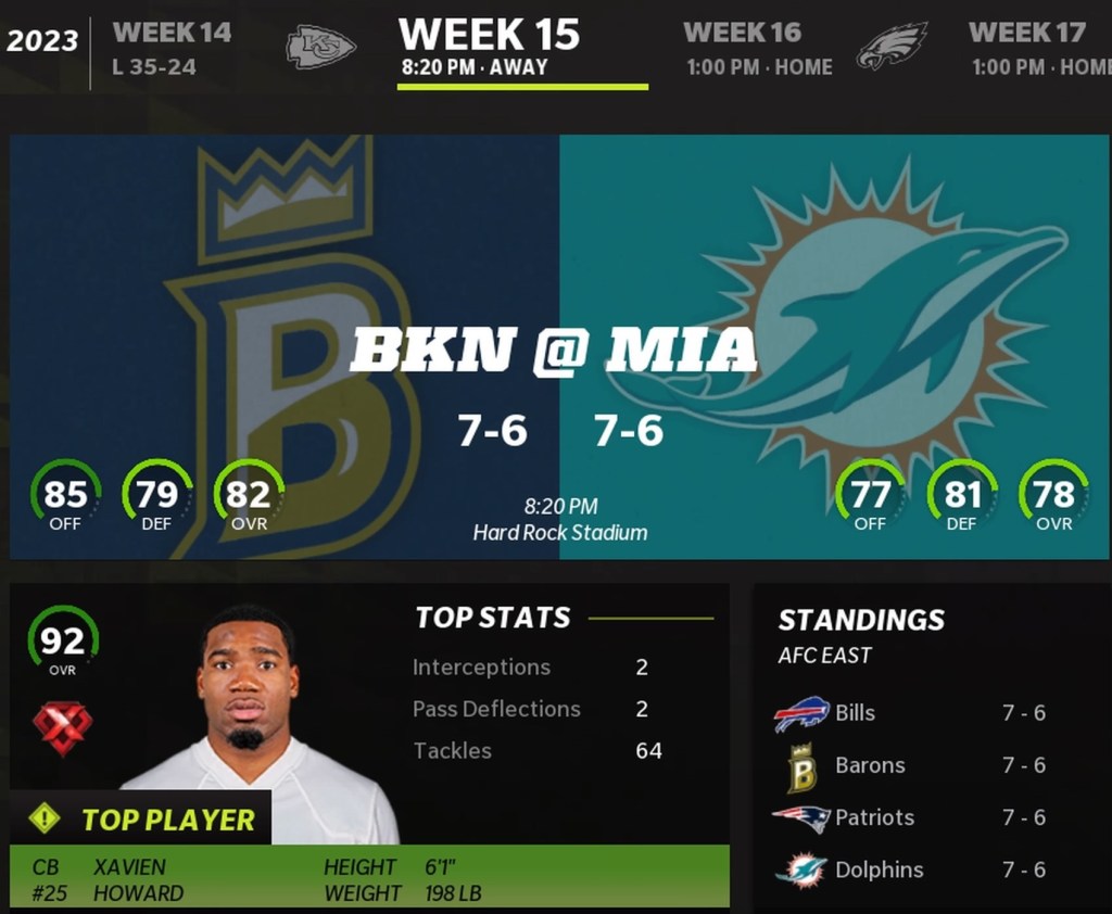 Brooklyn Barons (7-6) @ Miami Dolphins (7-6)