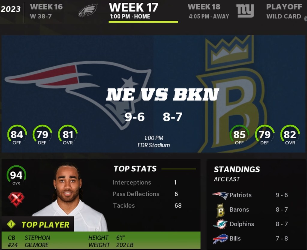Brooklyn Barons (8-7) vs New England Patriots (9-6)