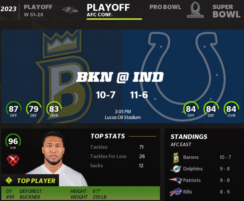 Brooklyn Barons (10-7) @ Indianapolis Colts (11-6)
