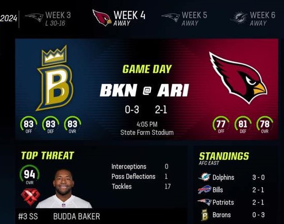 Brooklyn Barons (0-3) vs Arizona Cardinals(2-1)
