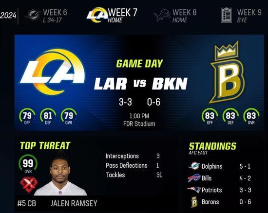 Brooklyn Barons (0-6) vs Los Angeles Rams (3-3)