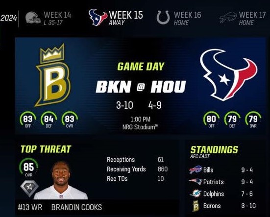 Brooklyn Barons (3-10) vs Houston Texans (4-9)