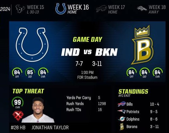 Brooklyn Barons (3-11) vs Indianapolis Colts (7-7)
