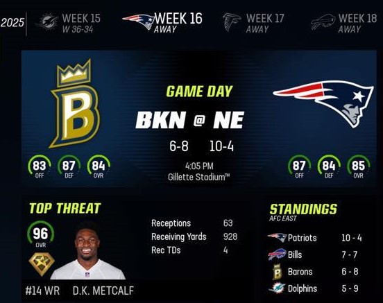 Brooklyn Barons (6-8) vs New England Patriots (10-4)