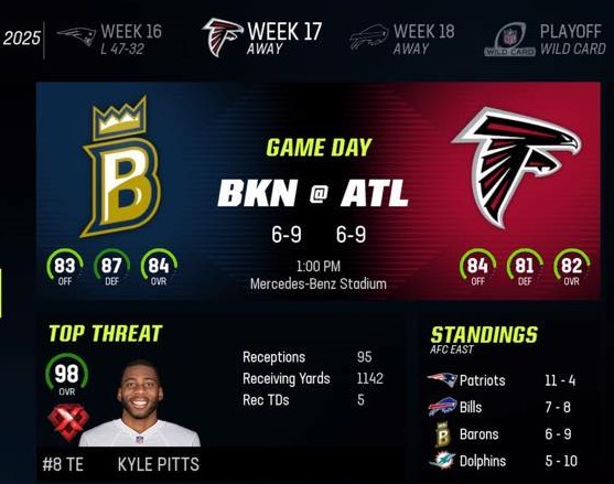 Barons head to Atlanta taking on Kyle Pitts and the Falcons. Falcons under .500 just like the Barons and a probably just waiting for this season to end too. Barons look to bounce back after losing in New England.