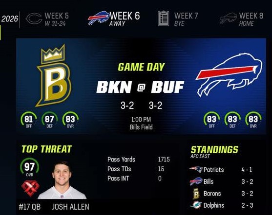 Barons head to their in-state division rivals the Buffalo Bills. Fresh off a win against the Bears, the Barons look to start a win streak and climb in the division standings.