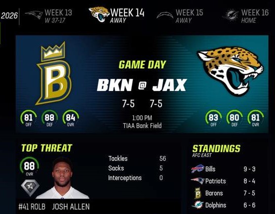 Madden 23 Sim – 2026 Season – Week 14 – Barons vs Jaguars