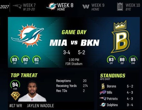 Brooklyn Barons (5-2) vs Miami Dolphins (3-4)