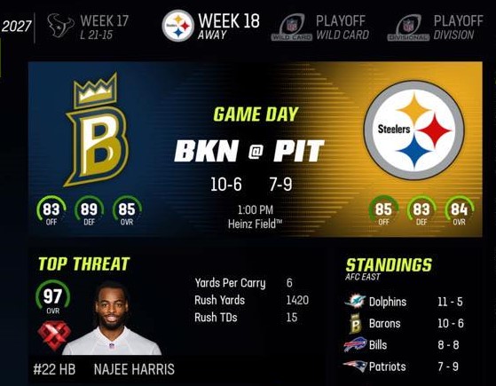 Looks like the Barons wont win the division but now its about seeding. Brooklyn finishes the regular season in Pittsburgh to take on the Steelers.