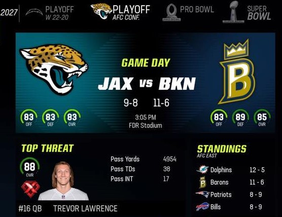 Brooklyn Barons (11-6) vs Jacksonville Jaguars (9-8)