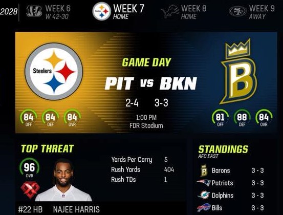 Brooklyn Barons (3-3) vs Pittsburgh Steelers (2-4)