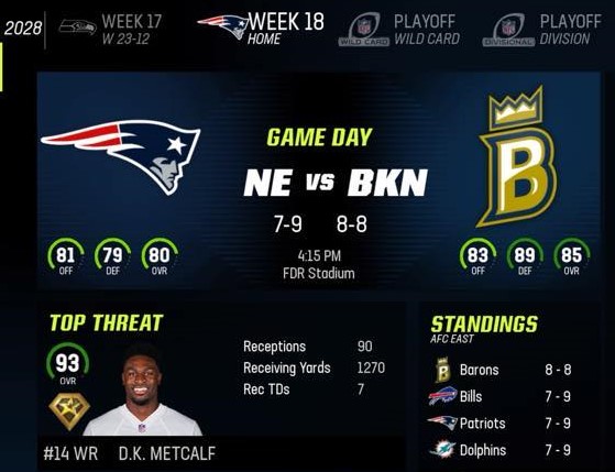 Brooklyn Barons (8-8) vs New England Patriots (7-9)