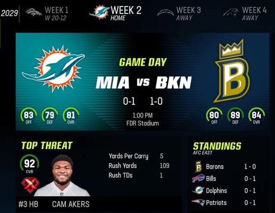 Brooklyn Barons (1-0) vs Miami Dolphins (0-1)